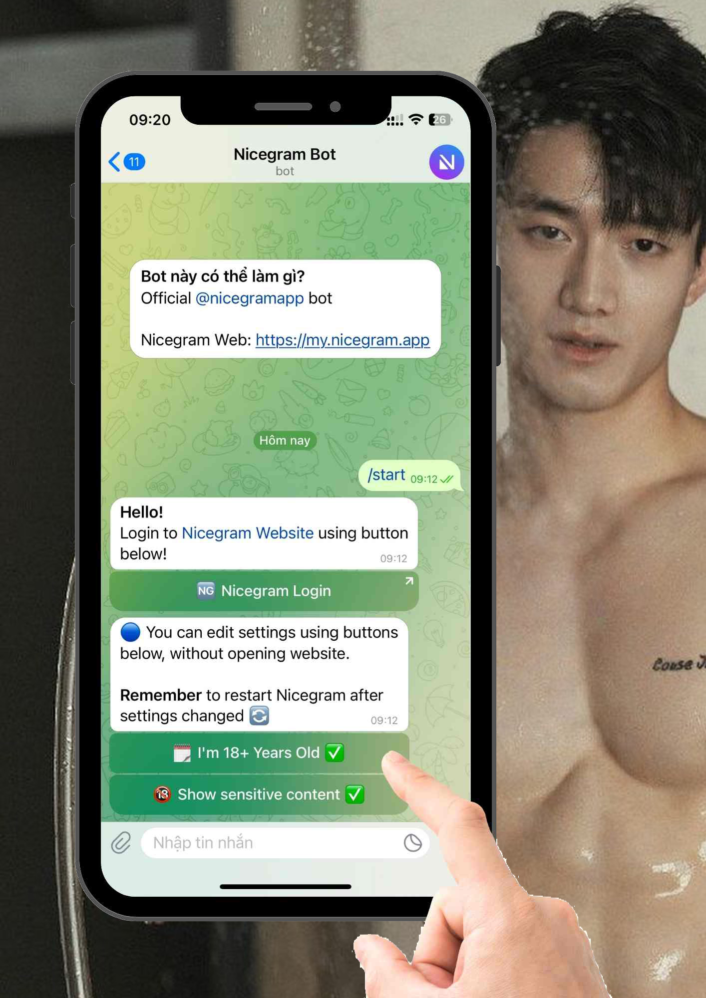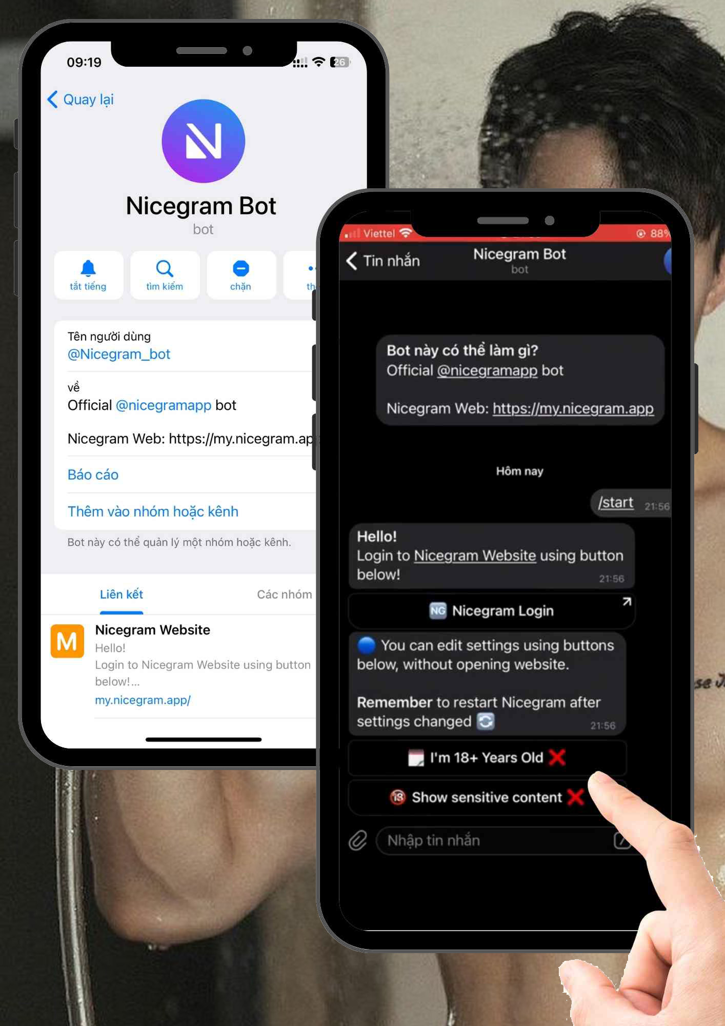 Tiếp theo hay chú ý chọn đúng Nicegram Bot (hình bên trái nè) và chỉ cần nhấn nút “Start” trong tin nhắn. Nhấn chọn 2 nút dấu “X” màu đỏ nhé.